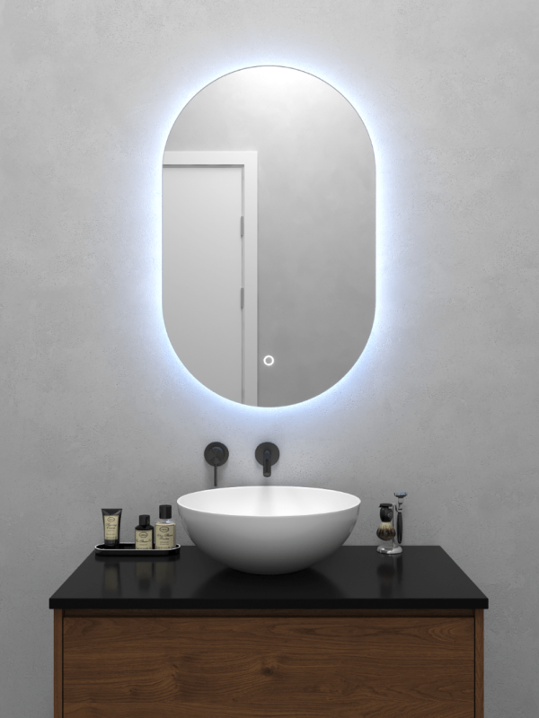 Безрамное зеркало овальной (капсульной) формы с контурной (тыльной) холодной подсветкой, свет 6000К. Подложка из высококачественного МДФ, светодиодная лента защищена матовым свето-рассеивателем от попадания пыли и влаги. Есть вывод 220W для подключения к сети, включение подсветки от сенсорной кнопки на зеркале.