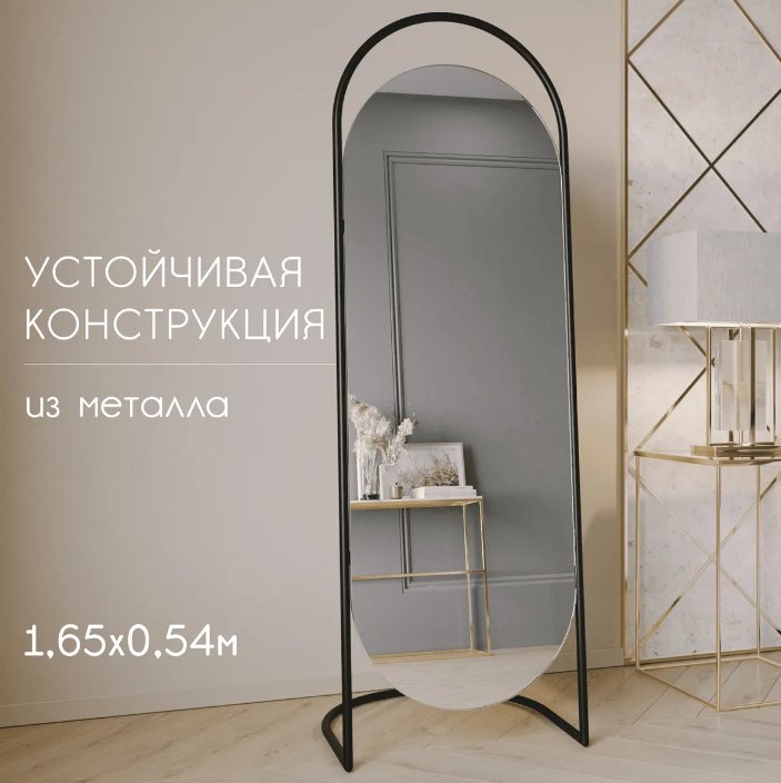 Зеркало «Queen». Артикул GMZ-01-1/2/3 Дизайнерское напольное зеркало в полный рост в металлической овальной раме ручной работы выполнено в минималистичном стиле. Простая изысканность форм и современный дизайн делает его уместным практически в любом интерьере. Оно может быть установлено в спальне, прихожей, гостиной, где за счёт своих внушительных размеров способно расширить пространство и создать иллюзию источника освещения. Зеркальное полотно изготовлено известным бельгийским производителем AGC и воплощает в себе старинные европейские традиции в совокупности с новейшими технологиями изготовления стекла. Наклон зеркала оптимальный фиксированный, что позволяет отражать любой рост.Характеристики:– профиль рамы – труба, диаметром 20 мм; – габариты – 1650х540х400 мм; – размер зеркального полотна – 1350х500 мм, толщина – 4 мм; – вес – 11 кг; – устойчивая двухслойная порошковая окраска; – возможные цвета – золотой, чёрный, белый.